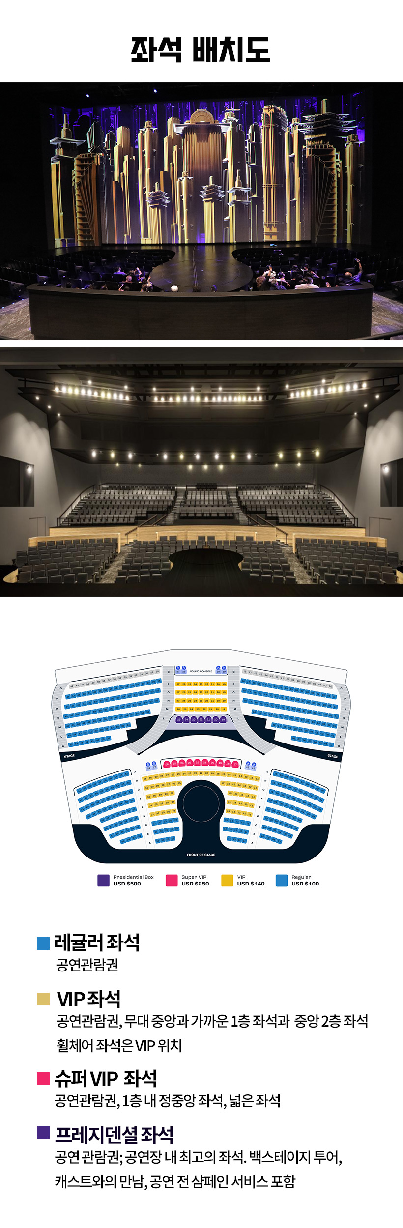 프레지덴셜 좌석: 카레라 공연 1회 입장권 포함, 공연장 내 최고 좌석, 백스테이지 투어, 캐스트와의 만남, 공연 전 샴페인 서비스 포함