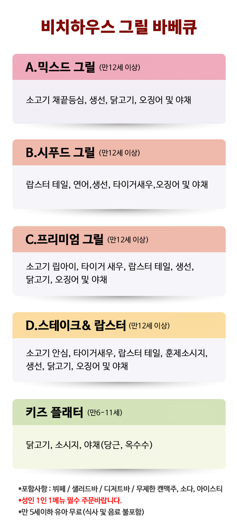 - 바베큐식사, 샐러드바, 무제한 생맥주 및 음료(소다,아이스티)