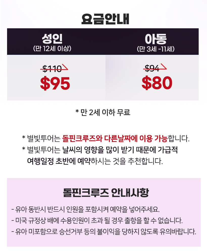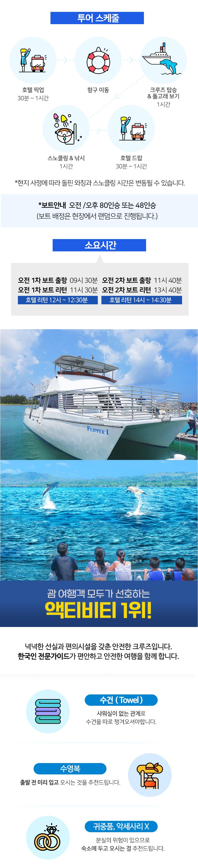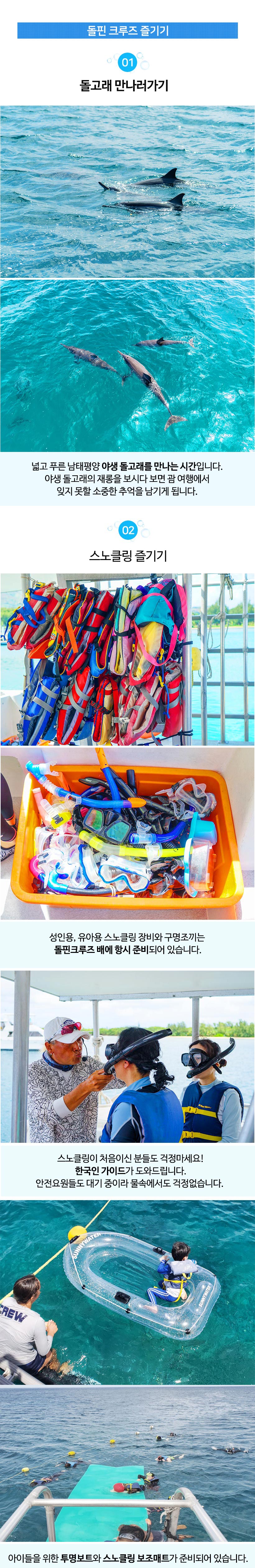 📌 체크포인트 ◾돌핀와칭과 별빛투어를 한번에~🏝️ 1. 운영시간 오전/ 오후 2. 연령기준 성인 만12세 이상,아동 만 3세~11세, 유아 만 3세 미만 (36개월 미만) *유아 동반시 필수 인원 선택해 주셔야하며, 미표기로 인해 승선거부 및 불이익을 당하지 않도록 유의바랍니다. 3. 준비물 및 복장 수영복, 카메라, 수건, 선글라스, 자외선차단제 <포함사항> - 호텔 픽업 드롭 서비스 - 스노클링 장비 / 낚시대 / 구명조끼 - 아동용 투명보트 / 스노클링 보조매트 - 참치회 /샌드위치, 스낵 / 음료 및 맥주 - 별빛투어 픽업 드랍 서비스 (개별이동 불가) - 별빛투어시, 클리프 바 음료쿠폰 (맥주,소다,칵테일 중 택1), 컵라면 <불포함사항> - 수건, 수영복 등 개인용품 - 개인경비 - 여행자보험 [주의사항] - 해외여행 중 만일의 경우에 대비해 여행자보험 가입을 권장합니다. - 별빛투어 진행날짜, 차수, 픽업호텔 필수로 기재해주셔야 정상 예약 됩니다. - 별빛투어 사진은 예약자 카카오톡으로 3~7일내 사진 다운로드 URL 발송해 드립니다. (정확한 휴대폰 번호 기재) - 아이들이 다치지 않도록 보호자의 각별한 주의바랍니다. - 스노클링 및 낚시체험시 물고기에 물리거나 날카로운 산호에 다치지 않도록 개인안전에 주의바랍니다. - 안전장비(구명조끼)를 반드시 착용해야 하며 안전요원의 보호 없이 바다 뛰어드는 행위는 금지합니다. - 현지 투어 이용시 문제가 발생했을 경우 즉각 해당 업체에 연락을 취해 조치를 받으시기 바랍니다. - 픽업시간은 현지 교통사정에 의해 조금 늦어질 수 있는 점 양해부탁드립니다.