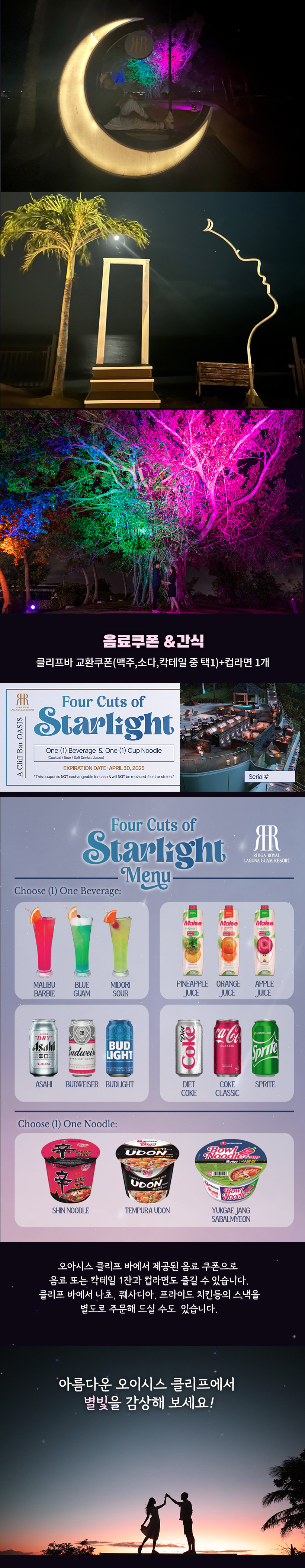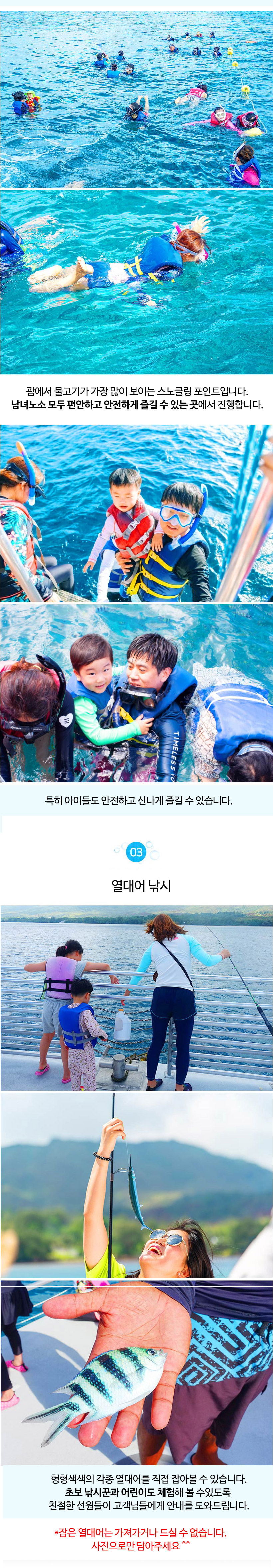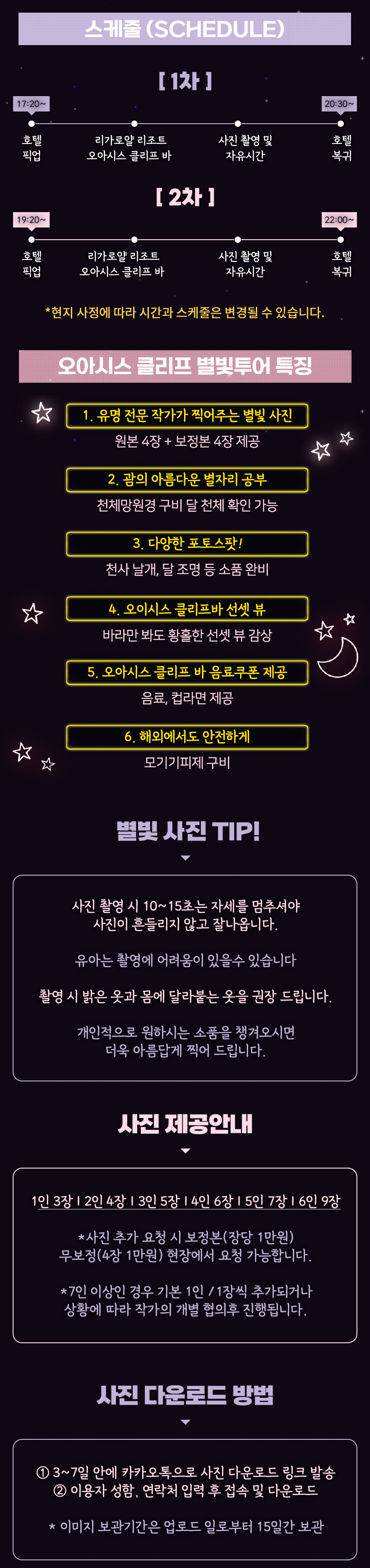 📌 체크포인트 ◾돌핀와칭과 별빛투어를 한번에~🏝️ 1. 운영시간 오전/ 오후 2. 연령기준 성인 만12세 이상,아동 만 3세~11세, 유아 만 3세 미만 (36개월 미만) *유아 동반시 필수 인원 선택해 주셔야하며, 미표기로 인해 승선거부 및 불이익을 당하지 않도록 유의바랍니다. 3. 준비물 및 복장 수영복, 카메라, 수건, 선글라스, 자외선차단제 <포함사항> - 호텔 픽업 드롭 서비스 - 스노클링 장비 / 낚시대 / 구명조끼 - 아동용 투명보트 / 스노클링 보조매트 - 참치회 /샌드위치, 스낵 / 음료 및 맥주 - 별빛투어 픽업 드랍 서비스 (개별이동 불가) - 별빛투어시, 클리프 바 음료쿠폰 (맥주,소다,칵테일 중 택1), 컵라면 <불포함사항> - 수건, 수영복 등 개인용품 - 개인경비 - 여행자보험 [주의사항] - 해외여행 중 만일의 경우에 대비해 여행자보험 가입을 권장합니다. - 별빛투어 진행날짜, 차수, 픽업호텔 필수로 기재해주셔야 정상 예약 됩니다. - 별빛투어 사진은 예약자 카카오톡으로 3~7일내 사진 다운로드 URL 발송해 드립니다. (정확한 휴대폰 번호 기재) - 아이들이 다치지 않도록 보호자의 각별한 주의바랍니다. - 스노클링 및 낚시체험시 물고기에 물리거나 날카로운 산호에 다치지 않도록 개인안전에 주의바랍니다. - 안전장비(구명조끼)를 반드시 착용해야 하며 안전요원의 보호 없이 바다 뛰어드는 행위는 금지합니다. - 현지 투어 이용시 문제가 발생했을 경우 즉각 해당 업체에 연락을 취해 조치를 받으시기 바랍니다. - 픽업시간은 현지 교통사정에 의해 조금 늦어질 수 있는 점 양해부탁드립니다.