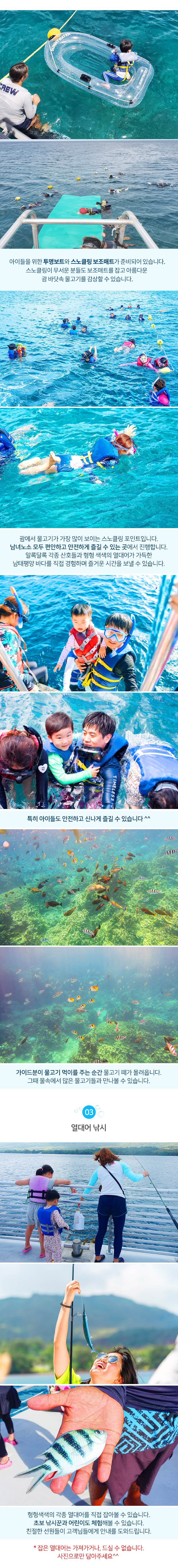 - 스노클링 및 낚시체험시 물고기에 물리거나 날카로운 산호에 다치지 않도록 개인안전에 주의바랍니다.