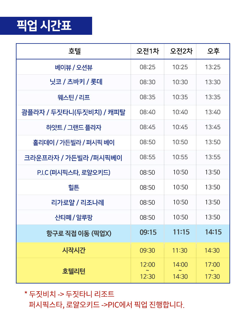 - 픽업시간은 현지 교통사정에 의해 조금 늦어질 수 있는 점 양해부탁드립니다.