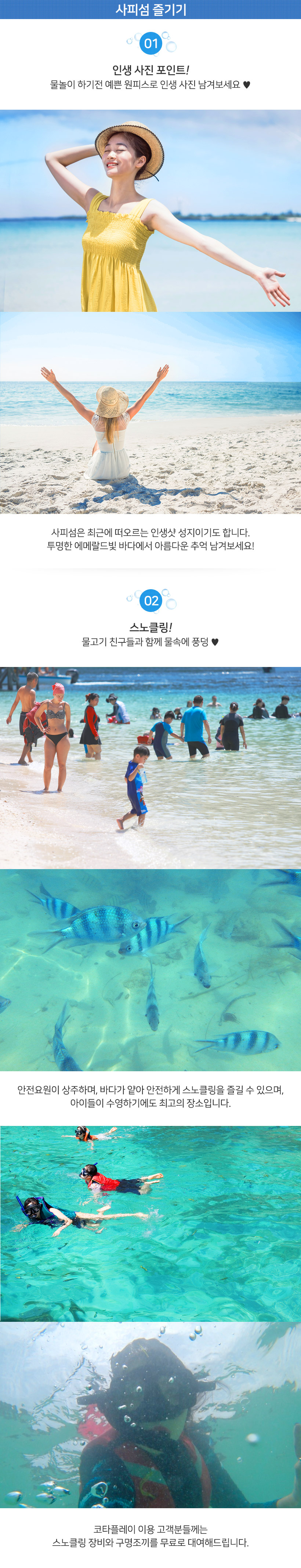 - 해양 액티비티는 안전문제로 가급적 사피섬에서만 즐기시길 추천합니다.