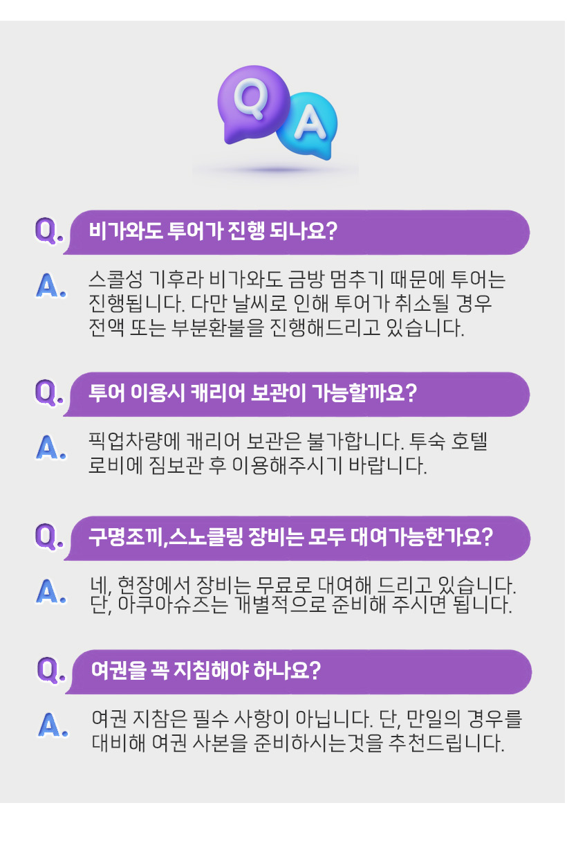 - 고객 부주의 등으로 발생한 부상 및 사고에 대해서는 본인이 책임져야 하며, 예약 대행사인 여행스타일링과 현지업체(이하 면책자들)에게 책임을 전가할 수 없습니다.