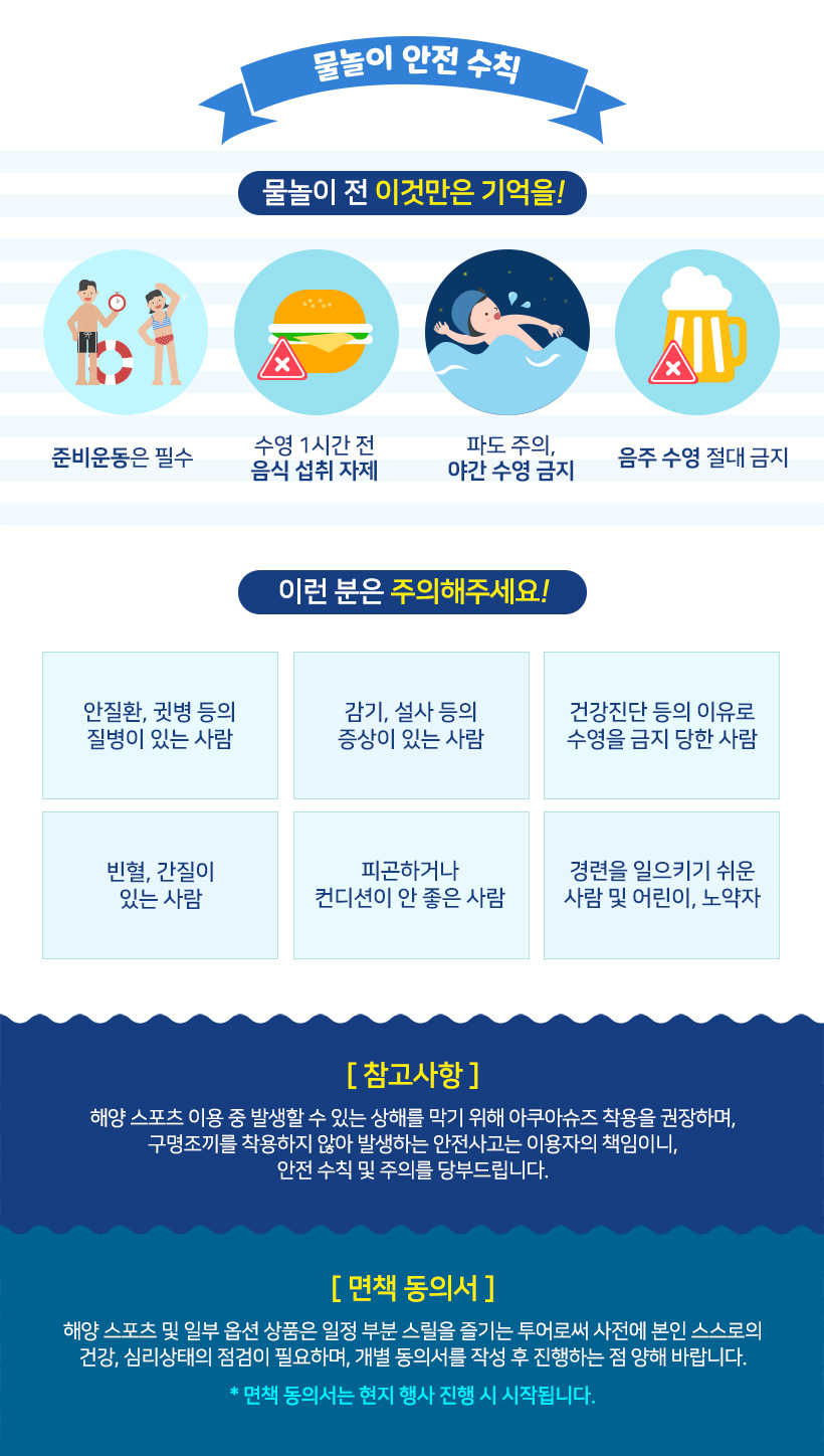 - 안전장비(구명조끼)를 반드시 착용해야 하며 안전요원의 보호 없이 바다 뛰어드는 행위는 금지합니다.