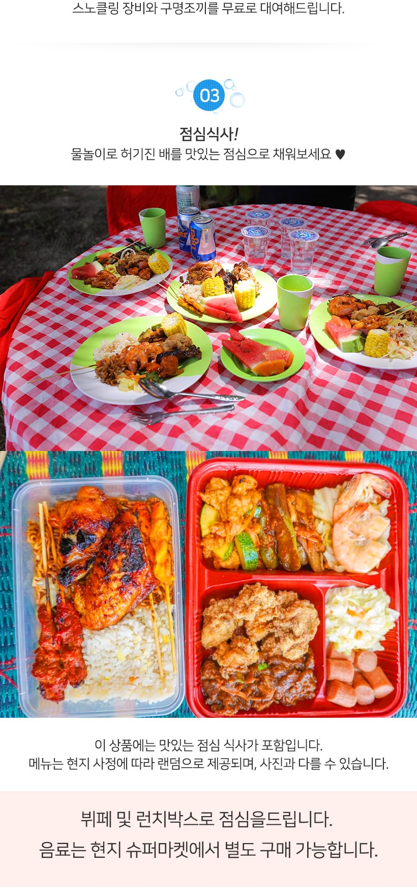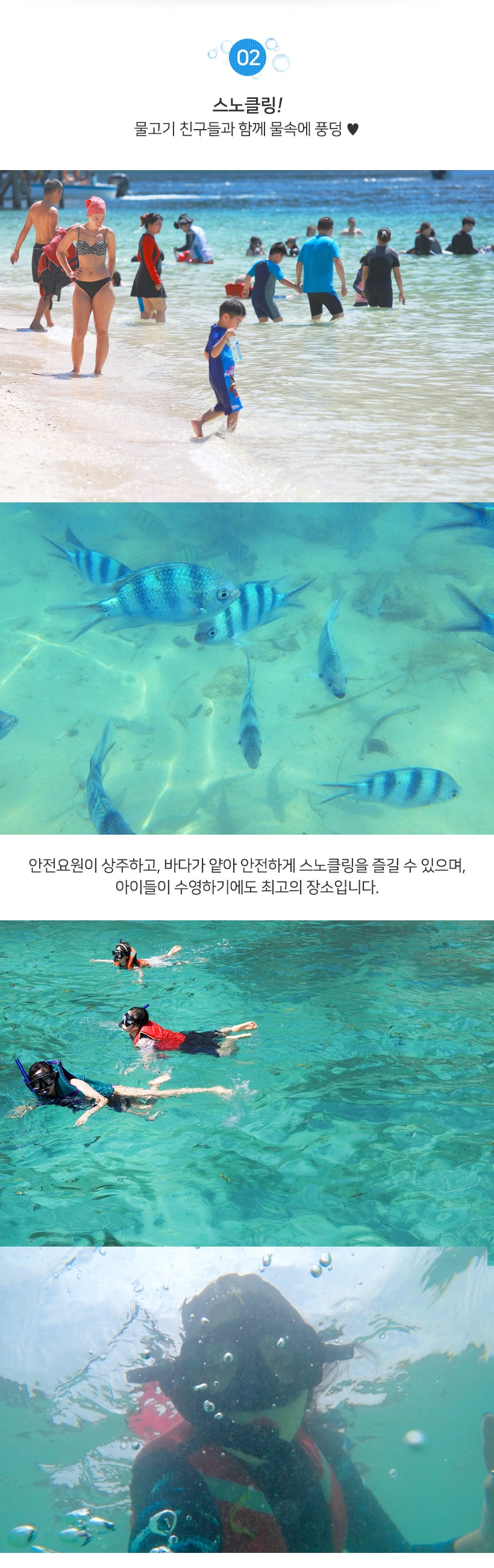 - 스노클링 체험시 날카로운 산호에 다치지 않도록 개인안전에 주의바랍니다.