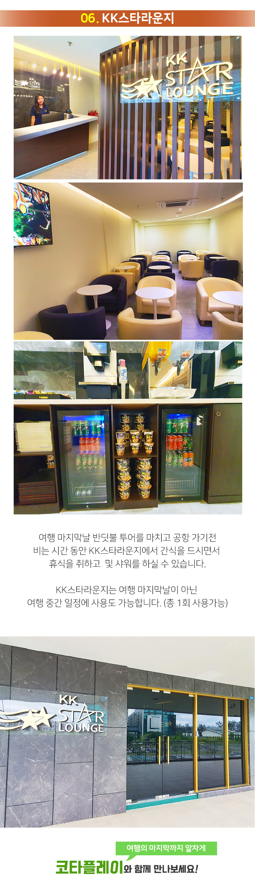 추가로 여행 마지막 날 KK 스타라운지에서 간식을 드시면서 편안한 휴식을 취할 수 있어요! (샤워도 가능)