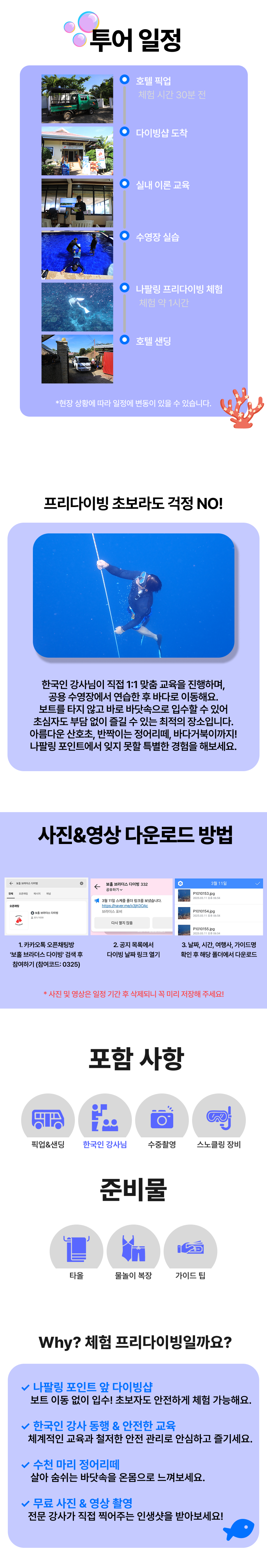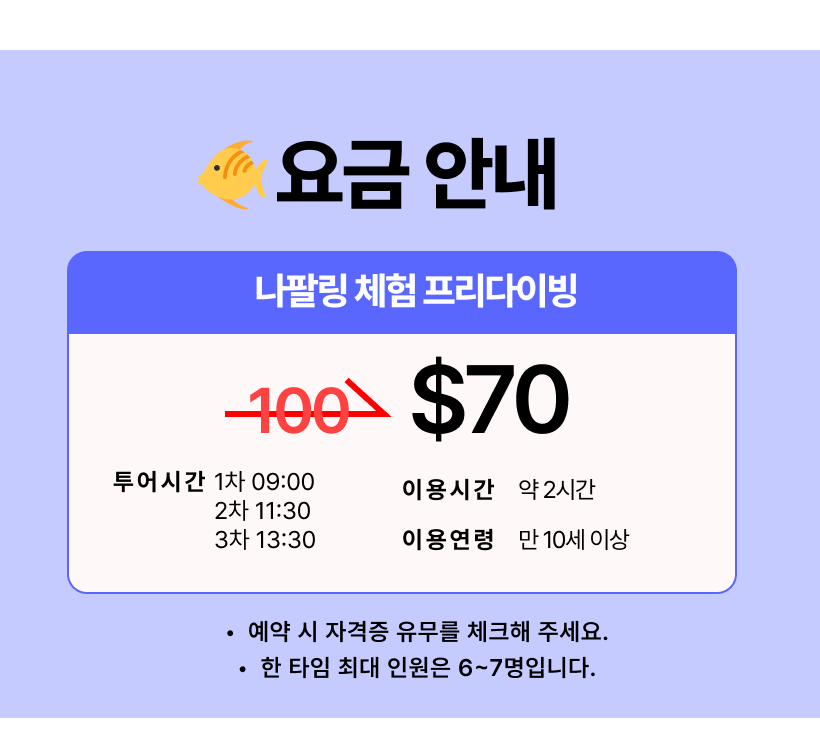 - 해당 옵션을 진행하는 안전 장비 (구명조끼)를 반드시 착용하며 안전요원의 보호 없이 바다 뛰어드는 행위 금지 합니다.
