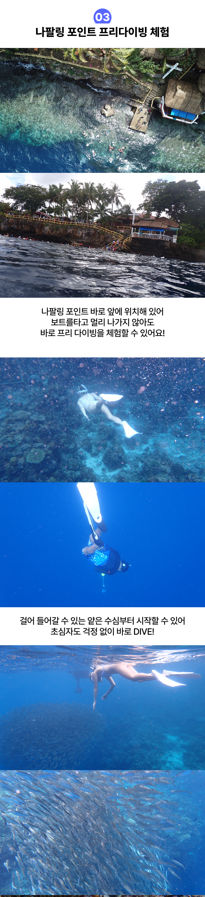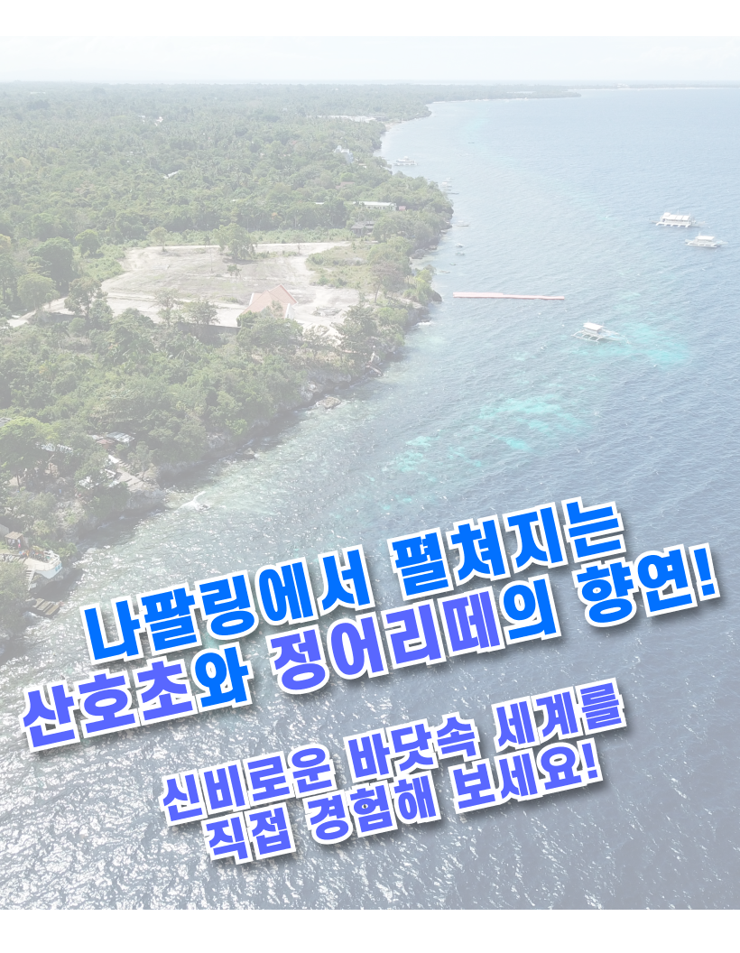 - 스노클링 및 낚시할 경우 물고기에 물리거나 날카로운 산호에 다치지 않도록 개인안전에 주의바랍니다.