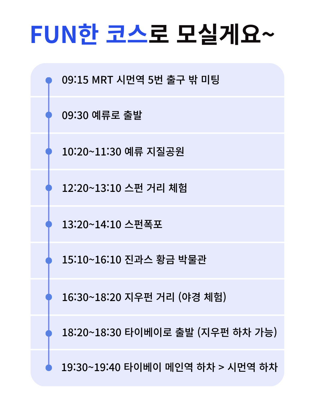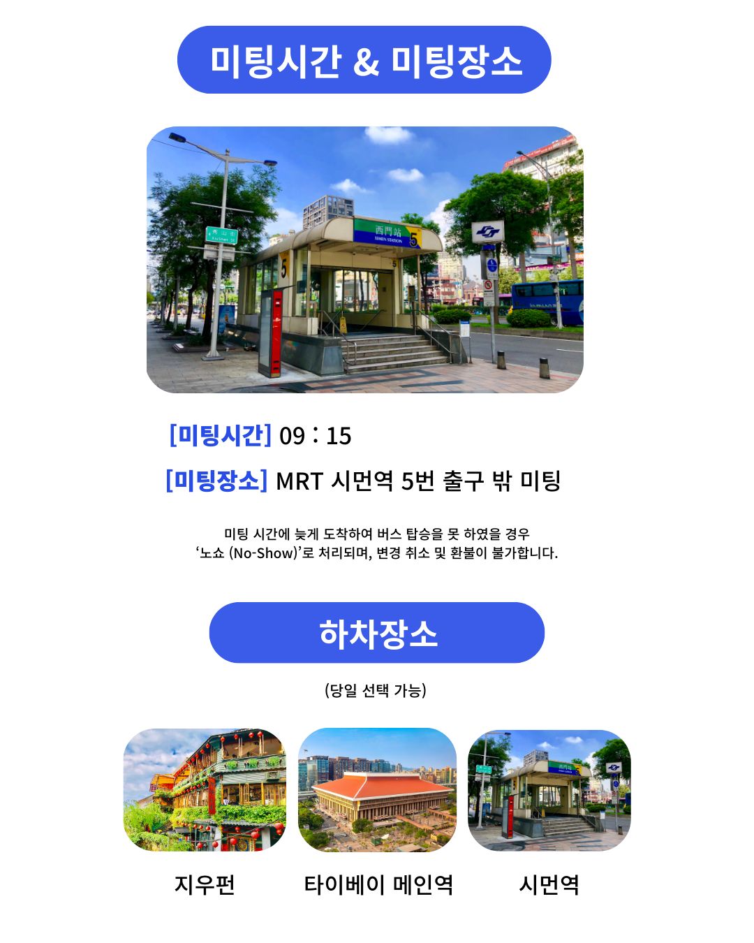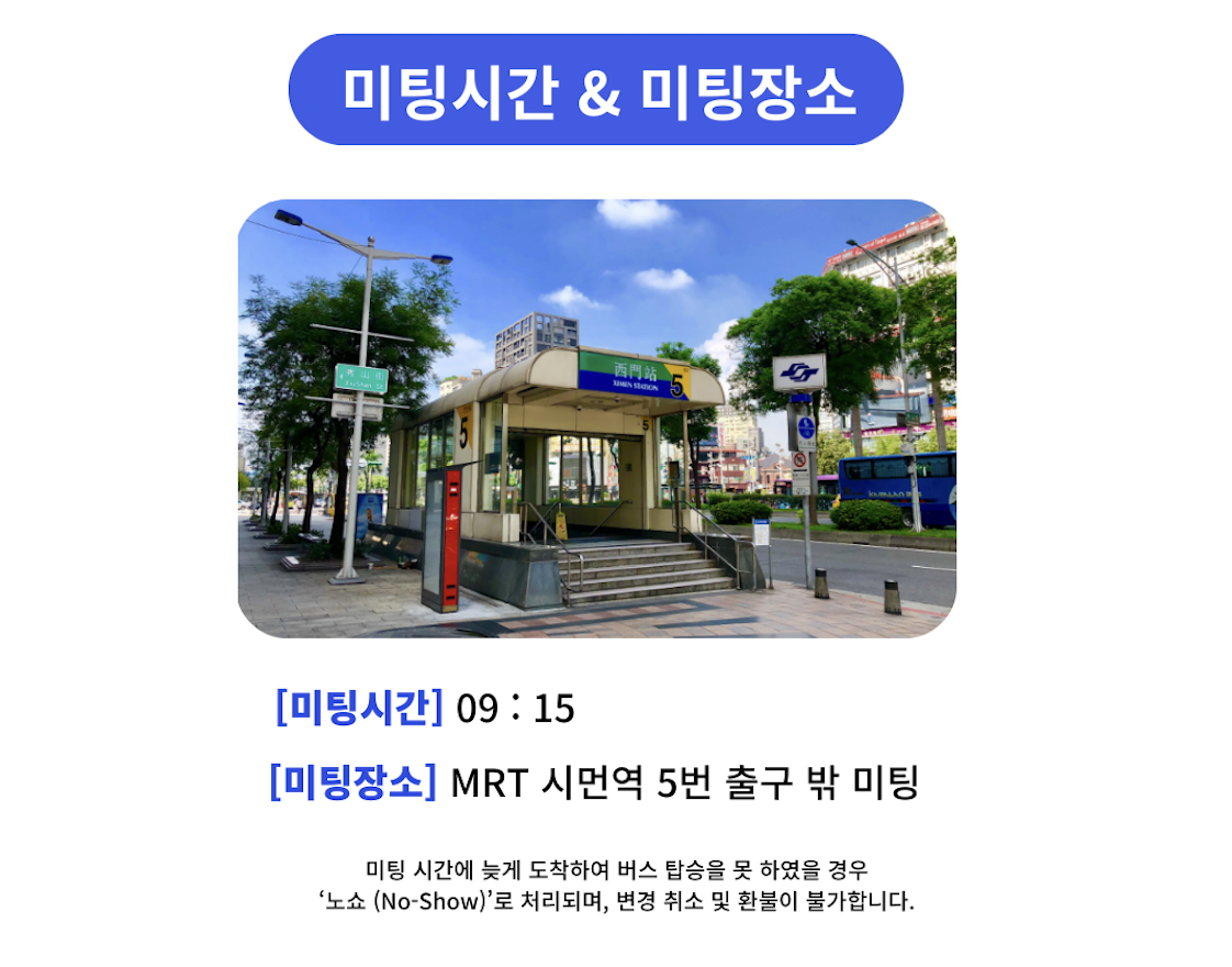 고정 미팅/하차 장소: 미팅 및 하차 장소는 MRT 시먼역 5번 출구 앞으로 고정되어 있으며, 개별적인 호텔 픽업/샌딩은 제공되지 않습니다.