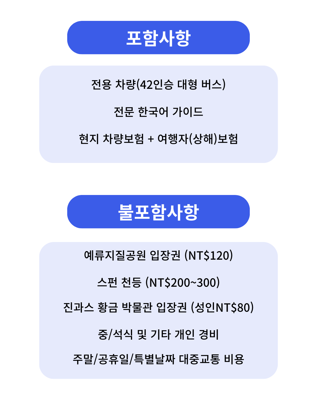 주말/공휴일 환승: 교통 통제로 인해 지우펀/진과스 입구에서 대중교통(시내버스)으로 환승해야 할 수 있습니다. 이 경우 발생하는 버스 요금(왕복 약 TWD 45)은 개인 부담입니다.