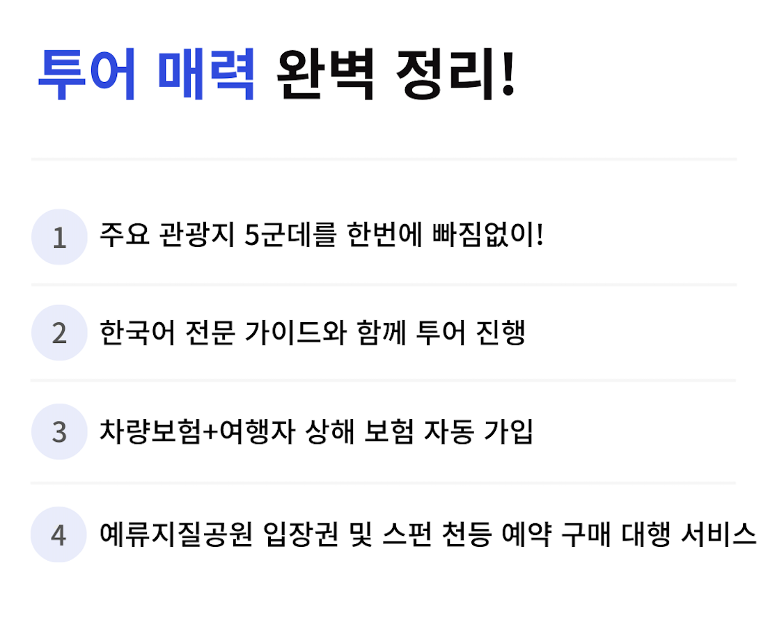 조인 투어: 본 투어는 다른 여행객과 함께하는 조인(Join-in) 투어로, 최소 출발 인원(8명) 미달 시 투어가 취소될 수 있습니다 (출발 3일 전 안내).
