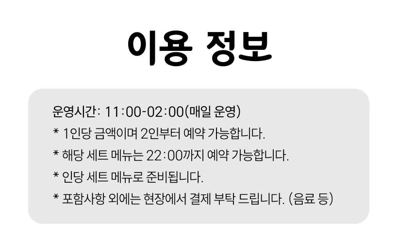 - 자리 및 식사가 예약되므로 인원수에 맞게 예약 부탁드립니다.
