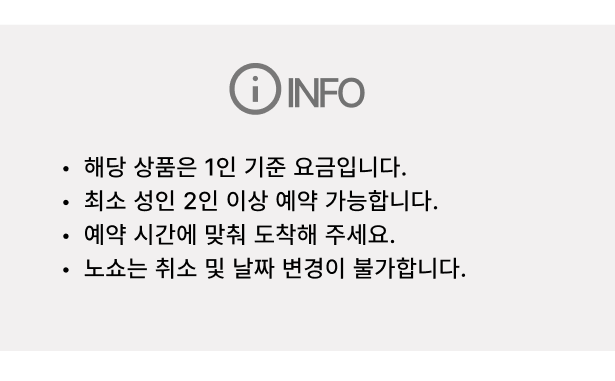 - 인원 미포함으로 발생한 현지 비용에 대해서는 책임지지 않으며, 현장에서 결제 해주셔야 합니다.
